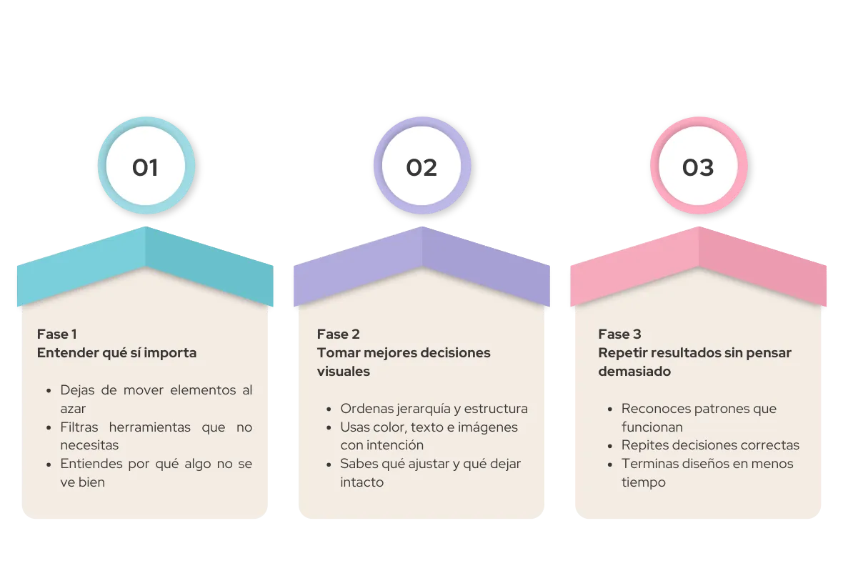 Si intentaras aprender Canva a prueba y error, perderías horas ajustando textos, colores y tamaños sin saber exactamente qué está fallando.
